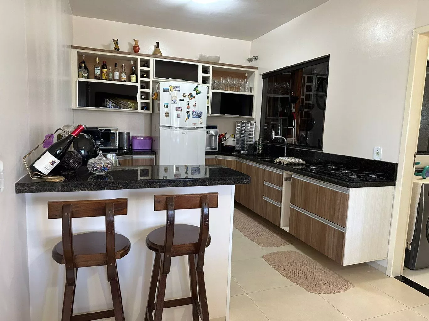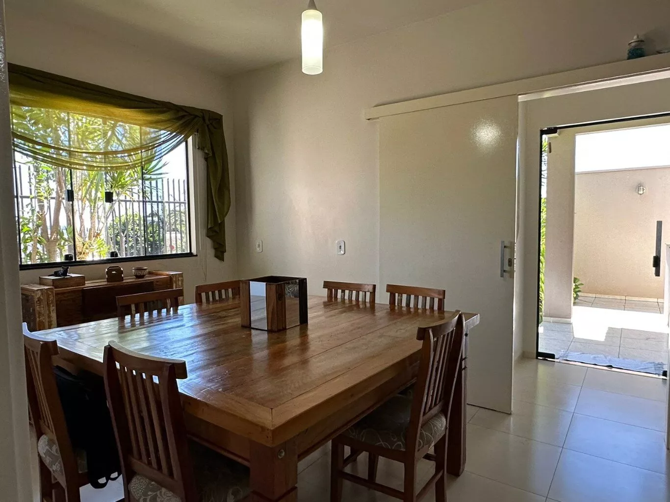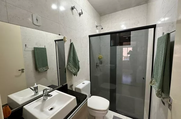 garagem, área de festas com churrasqueira, lavabo, área de serviço, despensa, sala de estar, sala de jantar, cozinha, 01 suíte, 02 quartos, banheiro social, escritório.