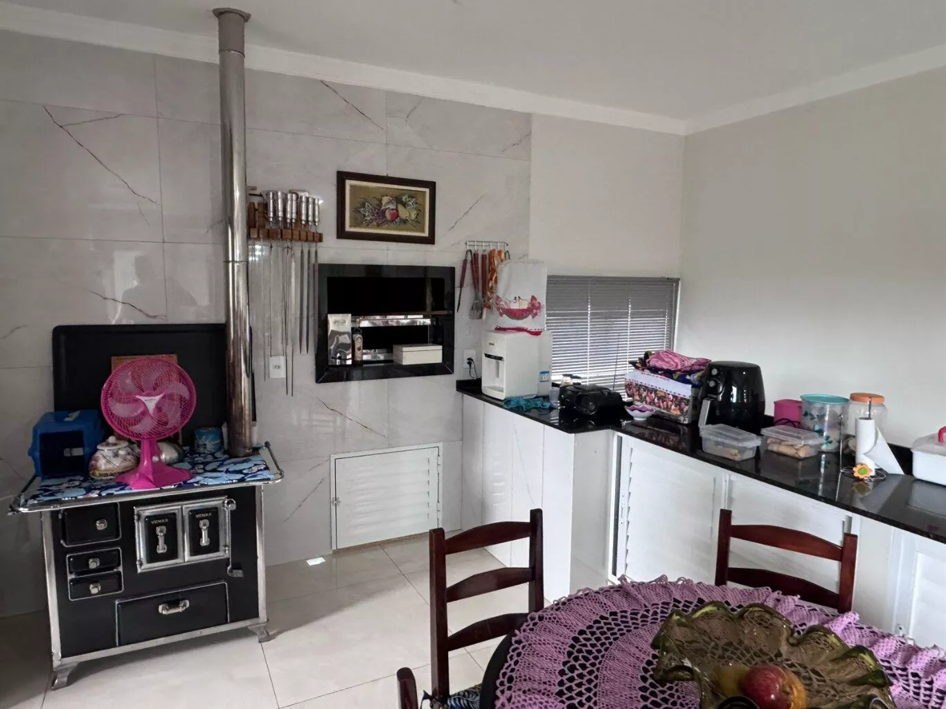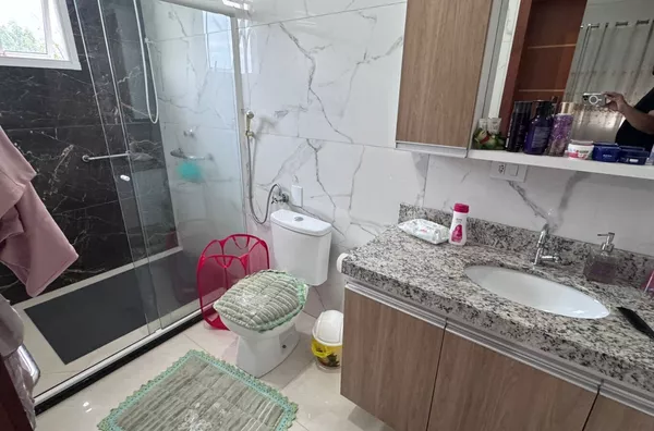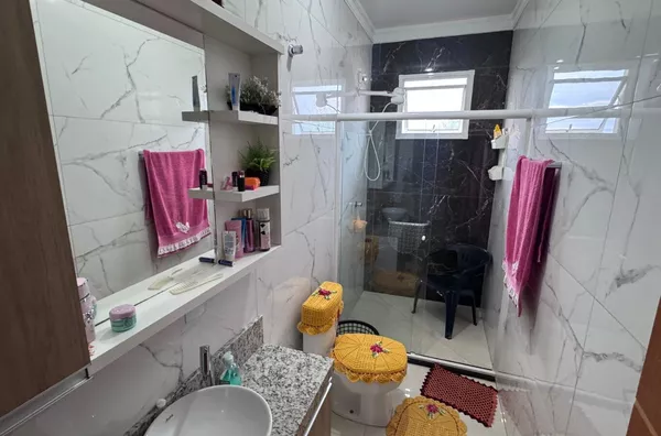 - Casa com dois pavimentos, sendo no pavimento superior, sala de estar/jantar e cozinha com churrasqueira, 3 amplos quartos (sendo 1 suíte) e área de serviço